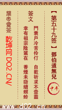 家道逐渐衰弱,人丁单薄,门户冷清,对于祈祷之事,没有任何一件实现,只会祈求,却不懂得付出是此签的重点,所以一直无法如愿。所幸祖先有积阴德,庇荫到此代,才不至于因此而断了香火。此签指出,由于人丁过于稀少,无法有自己的子嗣,但会有继子继承衣钵,以解决无后的问题。如果能多加积德,则能更加顺遂。