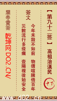 今年的收成与往年不能比,实在是少得可怜,因为天灾所致的歉收,造成了物价的大幅波动,这是百年来的大变动,因为无法防止的天灾,造成了传染病的流行,而且有致命的危险,必须到冬至时节,才得以控制,慢慢地回复以往。此签表示今年运气不佳,诸事不顺遂,必须要到年尾冬至,才能较平顺,然而一年即将过完了,表示凶多吉少,必须要特别谨慎小心。