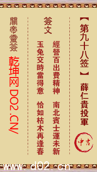 南部林某,经商失败,非常潦倒。求占于我,占得此签。我说:“目前困厄,犹如隆冬,春天一到,必转好运。”越两年春,忽得南洋友人资助,乃得重振旗鼓,东山再起。该年乃卯年,正应了第三句,而时逢春天,正应了第四句。