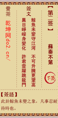 观音灵签第二签为下签,以苏秦不第喻示初战失利。此签暗示起步不顺,但劝您勿沮,通过努力可后来居上。签文鼓励坚持学习、待机再发。
